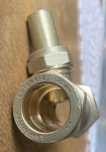 De sensor voor de leiding hebben we zelf gemaakt. Hieronder een paar foto's. De sensor die bij de temperatuurmeter is geleverd is het chrome stukje wat in de onderstaande foto is te zien. We hebben een koperen bus gemaakt waar de sensor in valt, om een beter contact met de koperen waterleidingbuis te krijgen.
