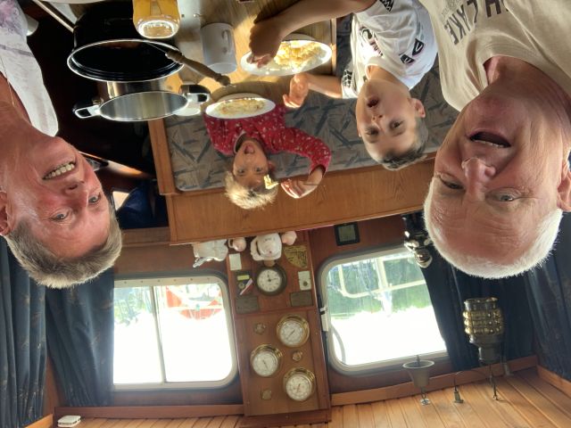 Links in de kast zit de doorspoelleiding die van de klep komt. Het spoelwater loopt in de haven. Met de doorlaat van deze 12mm leiding hebben we geëxperimenteerd om ongeveer 5 liter water in 1 minuut te spoelen. Hiervoor hebben we de leiding aan het einde afgedicht met een nippel waarin een gaatje van 4mm zit. Onze schakelklok heeft namelijk als kleinste instelling 1 minuut. Als het niet te warm is, wordt er toch driemaal per dag gespoeld en verbruiken we 15liter water. Dat is wel 3m³ water per jaar.