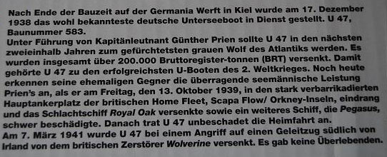 Na het eind van de bouwtijd op de Duitse werf in Kiel wordt op 17 december 1938 de bekende Duitse onderzeeboot U47 bouwnummer 583 in gebruik genomen. Onder bevel van Günther Prien zou de U47 in de volgende 2,5 jaar de gevreesde grijze wolf van de Noord-Atlantische wateren worden. Günther Prien was een van de meest beroemde U-boot commandanten uit de tweede wereldoorlog. Hij maakte deel uit van een elitegroep die een slachting uitvoerde in de koude diepte van de Noord-Atlantische wateren, in de boot die het nu beroemde embleem voerde, dat bekend is als "Der Stier von Scapa Flow".