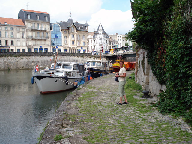 Om 10:44 zijn we al in Verdun. Alle ligplaatsen zijn bezet en we willen niet dubbel liggen. Net na de brug als je Verdun uitvaart, zijn bakboord een paar ligplaatsen waar je eigenlijk niet mag liggen. Omdat er al twee boten liggen, besluiten we er achter aan te sluiten. Je ligt hier aan een buitenbocht, maar er is toch geen scheepvaart. Maar ja, we liggen er nog maar net en er komt al een spits voorbij. Gelukkig heeft hij ruimte zat om de bocht te nemen. We bekijken de stad (erg gezellig) en bezoeken het overwinningsmonument bij de oude wal uit de XIIde eeuw.