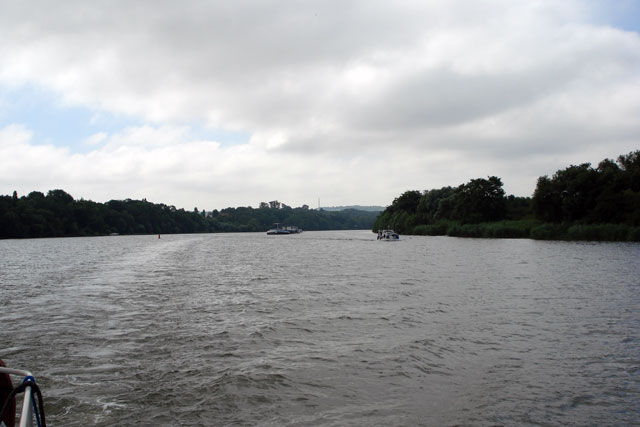 We drinken wat op de kant waar veel wandelaars en fietsers passeren. Later komt er nog een klein Nederlands passagiersschip buitenop het steiger liggen, maar die zeggen niet veel. Er ligt ook een Duits jachtje waarvan de eigenaar een praatje komt maken. Later bezoeken we de stad en het park.