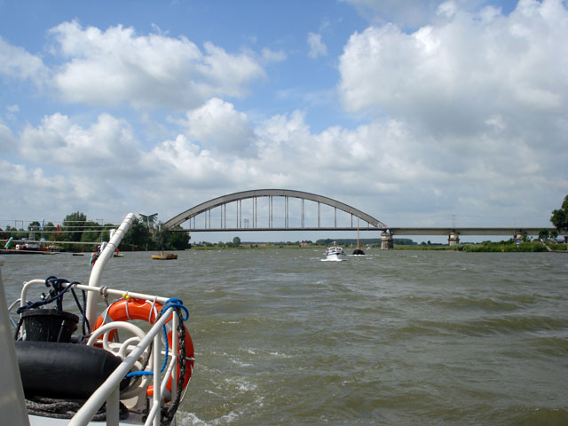 Om kwart voor tien varen we weg uit de dode arm bij sluis Hagestein na de ankers gelicht te hebben. Rijkswaterstaat is al een paar keer vlak langs onze boot gevaren om een diepte peiling uit te voeren. Sluis Amerongen gaat tijdelijk dicht en ze willen in deze dooie arm een wachtplaats inrichten.