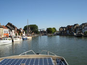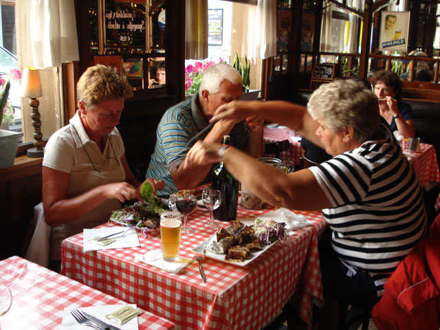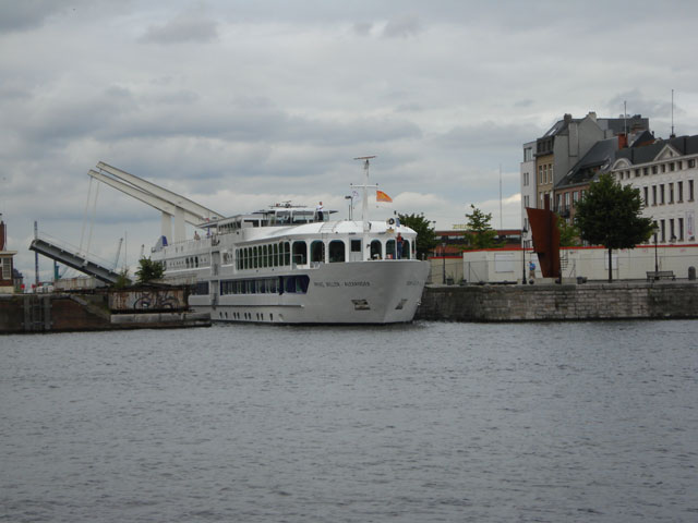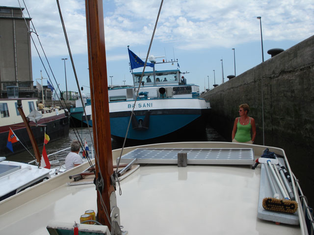 Als ik voor de stad de Royer sluis oproep, krijg ik nu een vrouw aan de marifoon en niet de vertrouwde stem van de man die wat we later hoorden met pensioen is gegaan. Het marifoon gesprek loopt niet zo vlot als het vroeger ging. We varen het laatste stuk langs de stad stationair en moeten nog eens 10minuten wachten voordat we de Royer sluis in mogen varen. Er is nog net plek voor drie jachten en we moeten naast elkaar achter een 110meter binnenschip vastmaken. De schipper van dit schip kijkt nergens naar en gooit de schroef in werking zodat we een behoorlijke zwaai in de sluis maken. Omdat onze touwen goed vaststaan op een bolder boven op de sluismuur loopt het gelukkig goed af. Onze touwen zijn door de sluiswachter aangepakt bij het binnenvaren van de sluis, want we konden er zelf niet af om vast te maken. In de jachthaven van Antwerpen in het Willemdok, krijgen we naast het havenkantoor een plek toegewezen. We moeten dan wel naast elkaar liggen. Na ons komt er nog een cruiseschip het dok binnen.